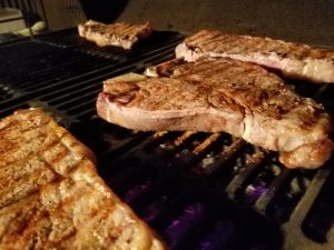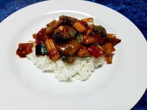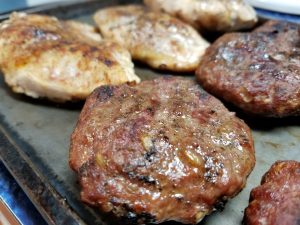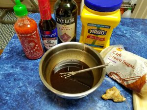 Next, I got the grill started. This is when I realized that I wanted to make some veggies to go with all this meat and bread. So I prepped some zucchini, red onion, and bell peppers (orange, red, and yellow) and I made my stir-fry brown sauce (which has to sit out for a bit…recipe