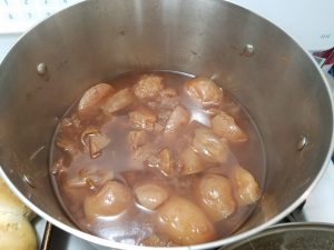 While the meat thawed, I cut the apples up and threw them in the pot with some water, sugar, cinnamon, and allspice. That’s got 3 hours of cook time ahead of it.