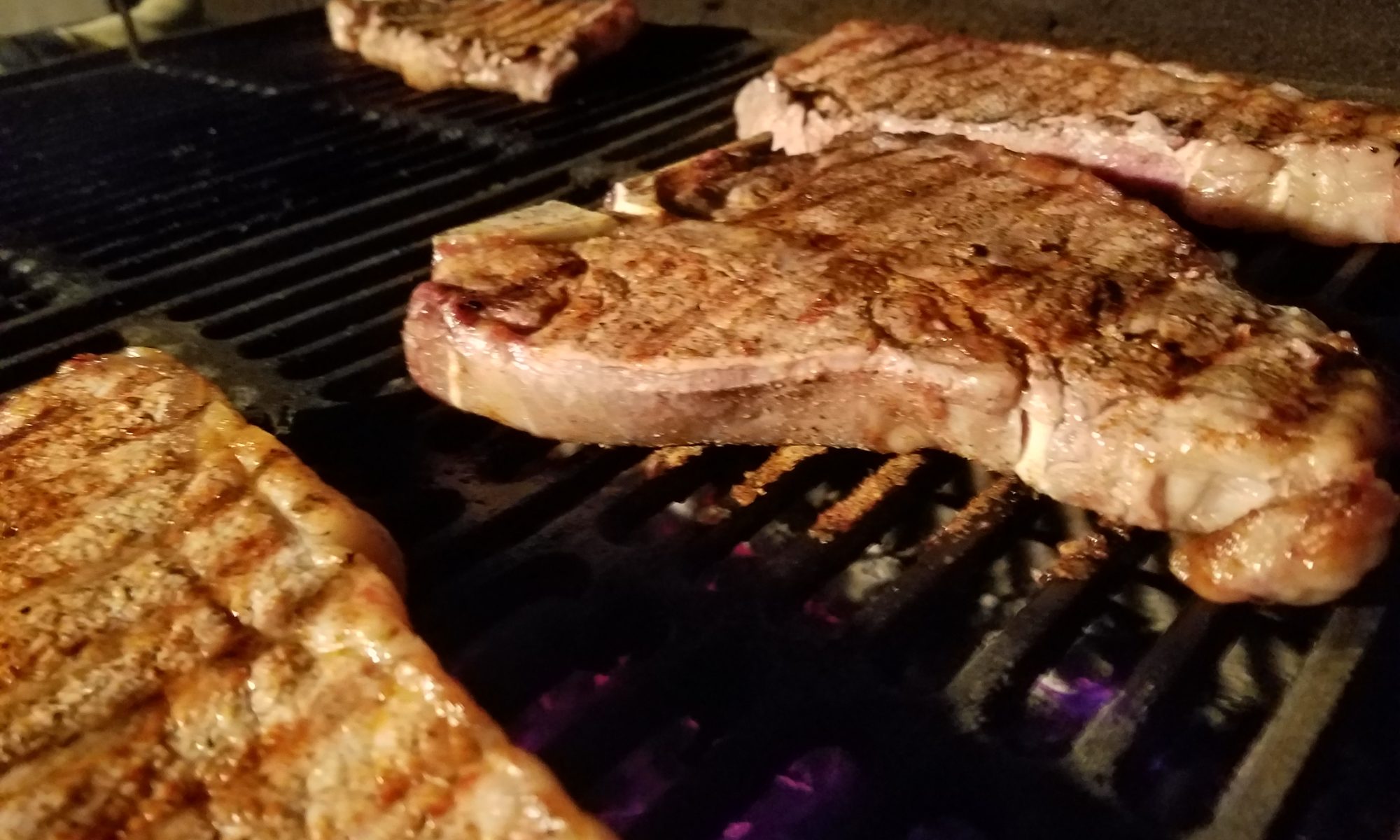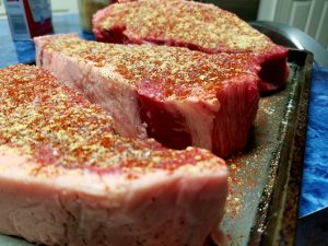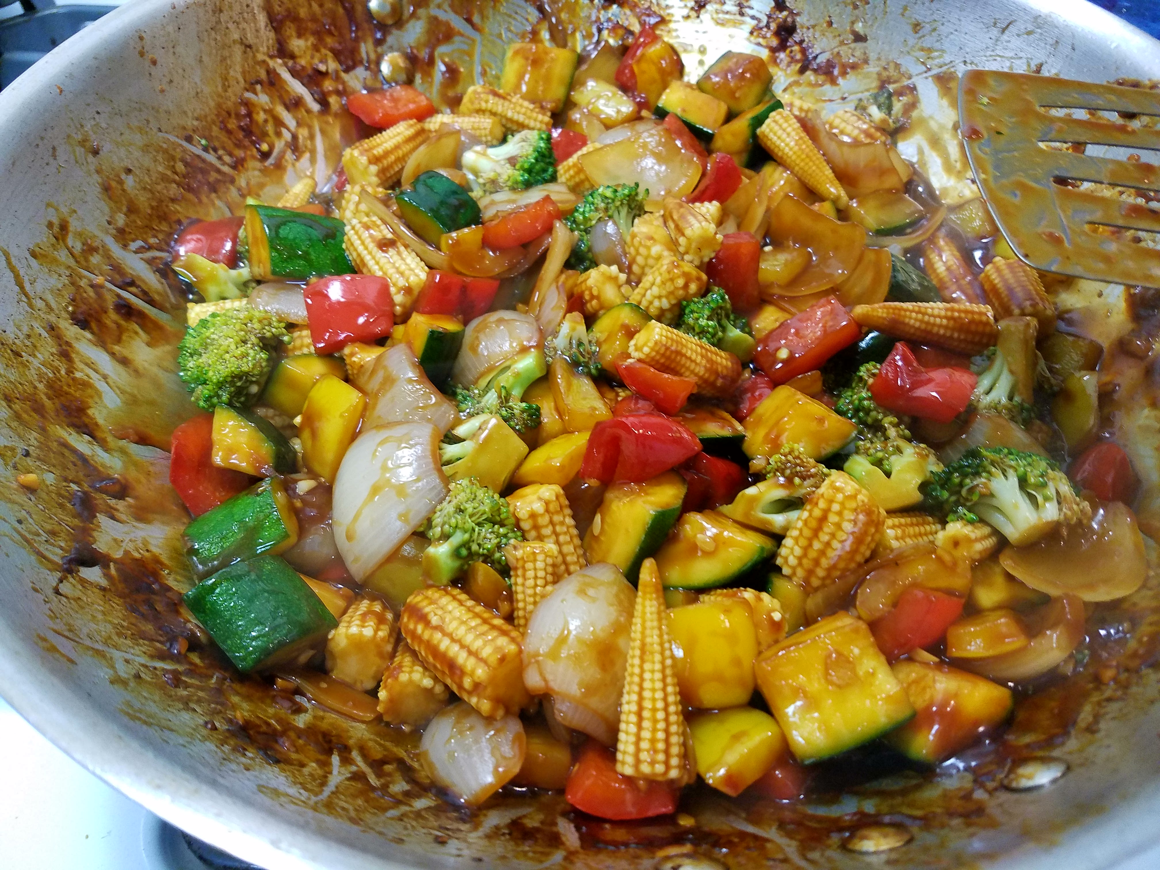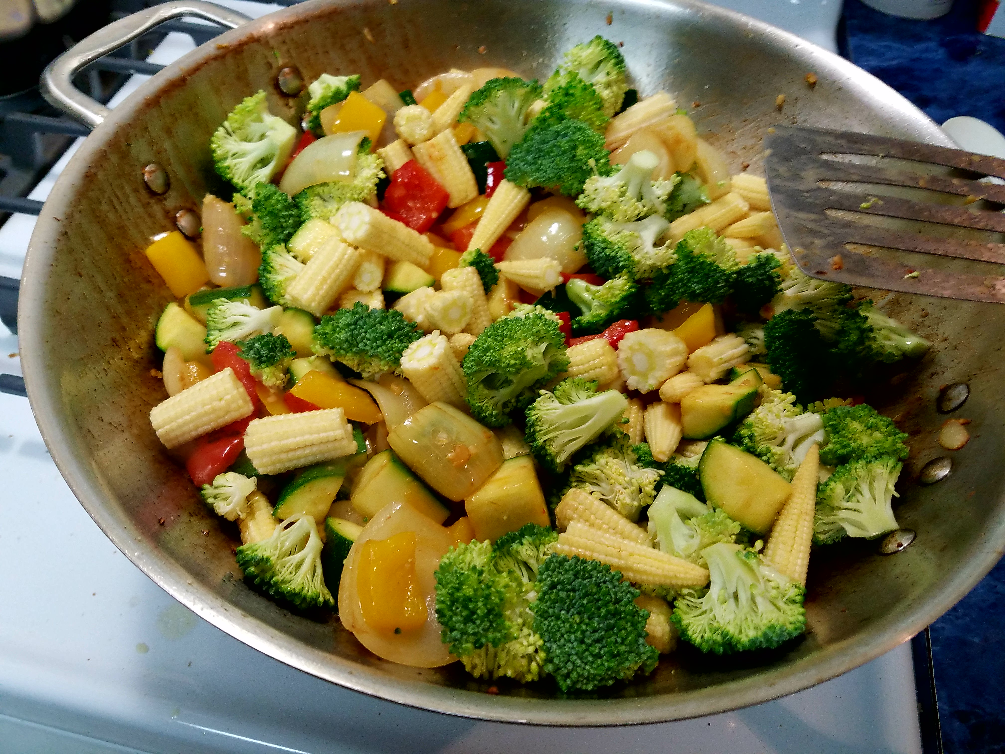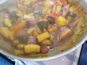 Next, I got the grill started. This is when I realized that I wanted to make some veggies to go with all this meat and bread. So I prepped some zucchini, red onion, and bell peppers (orange, red, and yellow) and I made my stir-fry brown sauce (which has to sit out for a bit…recipe