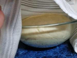 Use the last tablespoon of your stick of butter to lightly grease a large bowl (the larger the better, I use a 4 qt.). Make sure to get a little of the butter on your hands. Transfer the dough to the bowl. It is a this point you’ll understand “slightly stick and soft”. The dough will want to stick to your hands, but if you keep them moving on the dough to make a nice round ball, the dough won’t stick and it will should feel very soft. Cover with a lid (butter that lid!) or a very light and dry linen cloth. I prefer the lid. Let the dough rise for 90 mins. The dough will rise rather aggressively. It will actually pop the lid off my bowl. When it does, I lightly punch it down and replace the lid to let it finish out the 90 mins.