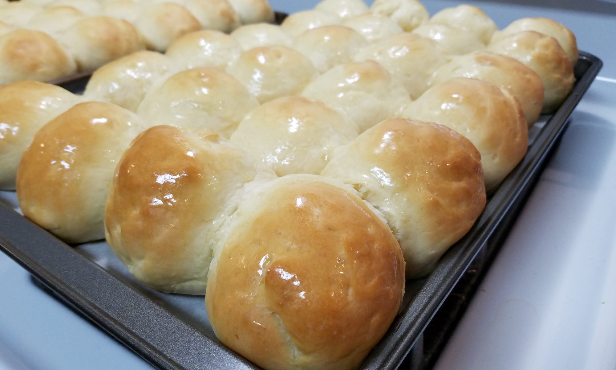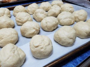 When the time is up, punch down the dough (get a little more butter on those hands) and start making 24 dough balls. Use a cookie sheet lined with parchment paper to set out four rows of six (or six rows of four). The balls should be close without touching. For more uniform rolls, I recommending using a kitchen scale and weighing out each balls to about 2.25-2.30 oz each.